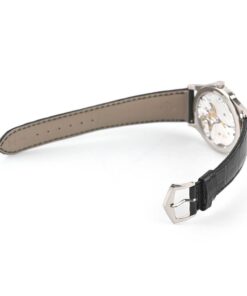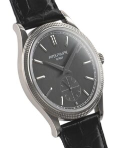 The Patek Philippe Calatrava 6119G-001 in 18k white gold features a guilloched hobnail bezel and manual-winding Caliber 30-255 PS movement. With its refined charcoal gray dial and timeless design, it embodies discreet sophistication—a watch for those who appreciate heritage, craftsmanship, and enduring elegance.
