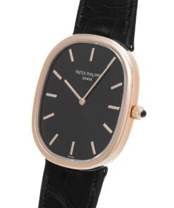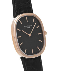 The Patek Philippe Golden Ellipse 5738R-001 in 18k rose gold features a distinctive elliptical case and sunburst ebony black dial. Powered by the self-winding Caliber 240, it blends technical excellence with timeless sophistication, embodying refined taste and understated luxury for discerning collectors.