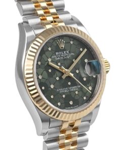 Crafted in resilient stainless steel with a yellow gold fluted bezel, the watch radiates quiet luxury. The olive green dial features an intricate floral motif, where 24 flowers are each adorned with a diamond at the center. Yellow gold hands and hour markers provide a warm contrast, enhancing legibility and elegance. A Cyclops lens magnifies the date at 3 o’clock, a signature hallmark of Rolex design. The Jubilee bracelet, fashioned in stainless steel and yellow gold, ensures supple comfort and lasting brilliance.