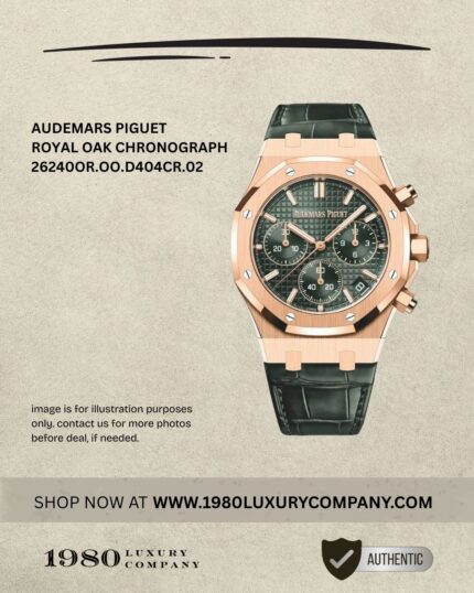 The Audemars Piguet Royal Oak Chronograph 26240OR.OO.D404CR.02 pairs 18k rose gold with a khaki green “Grande Tapisserie” dial. Driven by the self-winding Caliber 4401 with flyback chronograph, it embodies bold sport-luxury prestige—merging architectural design and mechanical mastery for those who command attention.