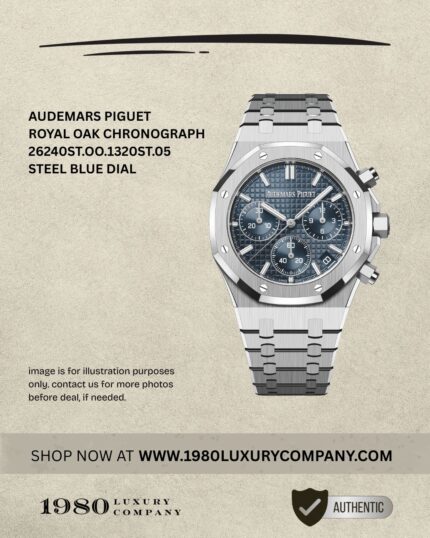 The Audemars Piguet Royal Oak Chronograph 26240ST.OO.1320ST.07 in stainless steel features a silver “Grande Tapisserie” dial and octagonal bezel. Powered by self-winding Caliber 4401 with chronograph, it blends technical mastery with bold, sporty-luxury elegance, perfect for collectors valuing style and horological prestige.