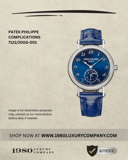 The Patek Philippe Complications 7121/200G-001 in 18k white gold features a dazzling diamond “Dentelle” bezel and blue sunburst dial with moon phase and small seconds. Powered by the manual Caliber 215 PS LU, it embodies timeless elegance and feminine sophistication for the refined connoisseur.