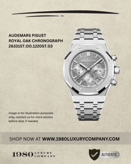 The Audemars Piguet Royal Oak Chronograph 26715ST.OO.1356ST.02 features a 38mm stainless steel case and bracelet with a grey “Grande Tapisserie” dial and silver-toned sub-dials. Powered by the automatic Calibre 2385, it offers a 40-hour power reserve and 50m water resistance. White gold luminescent hands and markers enhance legibility, while the integrated design and chronograph function reflect the Royal Oak’s signature blend of sportiness and elegance.