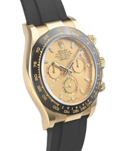 Crafted in radiant 18k yellow gold, the 40mm case exudes strength and presence without sacrificing refinement. The champagne dial gleams with warmth, contrasted by bold black sub-dials for legibility and balance. Its black Cerachrom bezel, engraved with a tachymeter scale, provides durability and modern flair. The Chromalight-filled hour markers and hands ensure visibility in dim light, while the supple Oysterflex bracelet offers both comfort and resilience. Together, these elements create a striking visual harmony that enhances any ensemble.