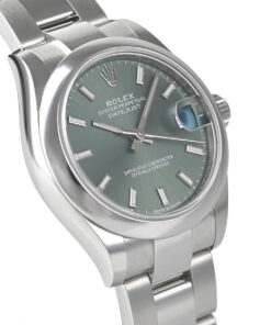 Crafted in resilient Oystersteel, the watch features a smooth bezel that enhances its minimalist elegance. The mint green dial presents a fresh and distinctive aesthetic, highlighted by Chromalight-filled markers and hands for lasting visibility. A date window at 3 o’clock, magnified by the Cyclops lens, ensures practicality without compromising elegance. The Oyster bracelet complements the case, uniting strength, comfort, and a streamlined silhouette that accentuates the design’s refined character.