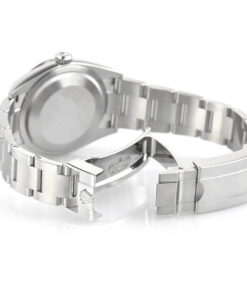 This model features a 36mm Oystersteel case renowned for its durability and polished beauty. The smooth bezel frames a deep black dial adorned with signature Arabic numerals at 3, 6, and 9 o’clock. Chromalight-filled markers and hands ensure visibility in all conditions, highlighting Rolex’s dedication to performance. Driven by the self-winding Caliber 3230, it offers a 70-hour power reserve. Water resistance of 100 meters underscores its robust reliability.