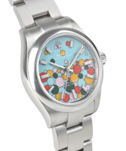 Crafted from robust Oystersteel, the case demonstrates strength and elegance in equal measure. Its smooth bezel highlights clean lines, while the turquoise dial captivates with a playful celebration motif. Chromalight-filled hour markers and hands ensure excellent visibility in every light condition. Complementing the design, the Oyster bracelet delivers seamless comfort and enduring refinement, ensuring the watch is suitable for both formal and casual wear.